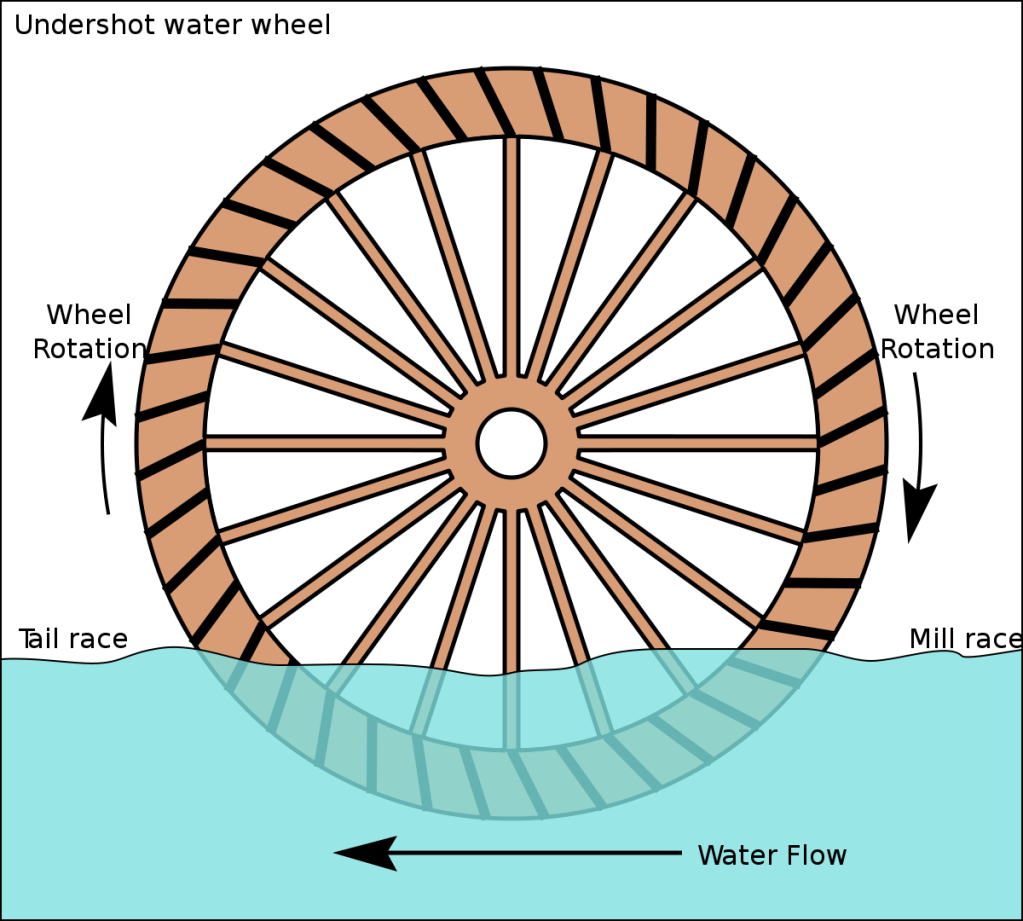 Tub mills, which originated in ancient times, were fitted with small, horizontal wooden wheels with angled paddles – a primitive kind of turbine. (These originally sat in a wooden frame or ‘tub,’ though these ‘tubs’ have since fallen out of use.) Sometimes these simple wooden turbines were placed directly on the edge of a stream to capture the power of the passing water.