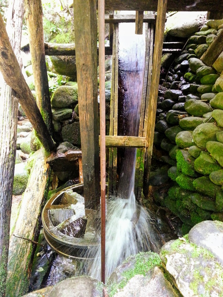 Simply put, water and gravity power grist mills. But the technology harnessing that energy actually varies a good bit. In any case, the force of moving water, through a series of mechanisms, turns the “runner stone” against a stationary mill stone, called the “bed.”