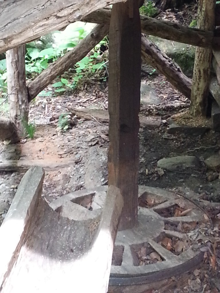 Water pressure shooting from the bottom of a penstock was strong enough to require an iron turbine. And an iron turbine had to be fabricated at a foundry or machine shop. The one at Mingus Mill was imported all the way from Ohio – at much greater expense. However, the turbine lasted a long time; the original one at Mingus Mill is still in use to this day. Additionally, since the turbine and the runner stone turn in the same direction, the stress produced on the mill building is negligible.