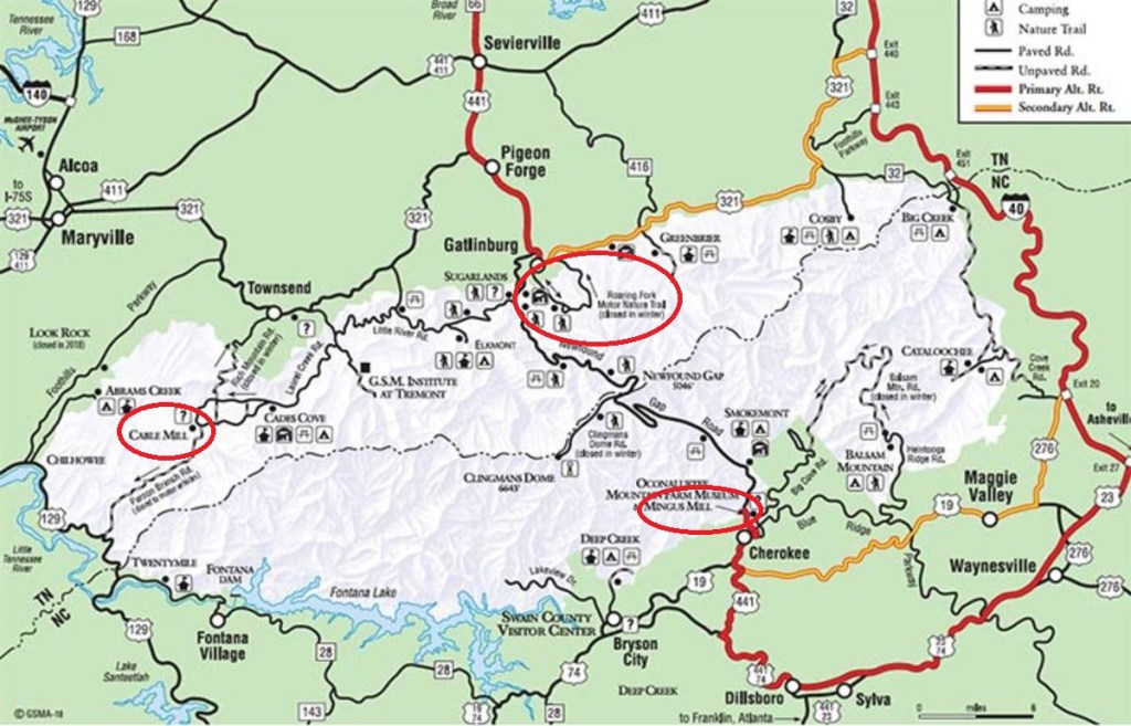 Cades Cove (Cable Mill) and Mingus Mill (near the Oconaluftee Visitor Center) shown with red circles.